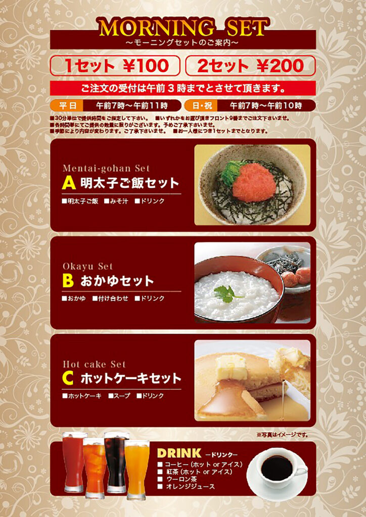 モーニングセット 2025 12/24 モーニングセットのご案内当店では、快適なご滞在をサポートするために、朝食を特別価格でご提供しております。 ご利用時間:午前7時~午前11時(日祝は午前10時) ご注文:ご注文の受付は午前3時までとさせて頂きます。 内容:1セット100円にてご提供 一日の始まりを、心地よい朝食とともにお楽しみください。 サービス