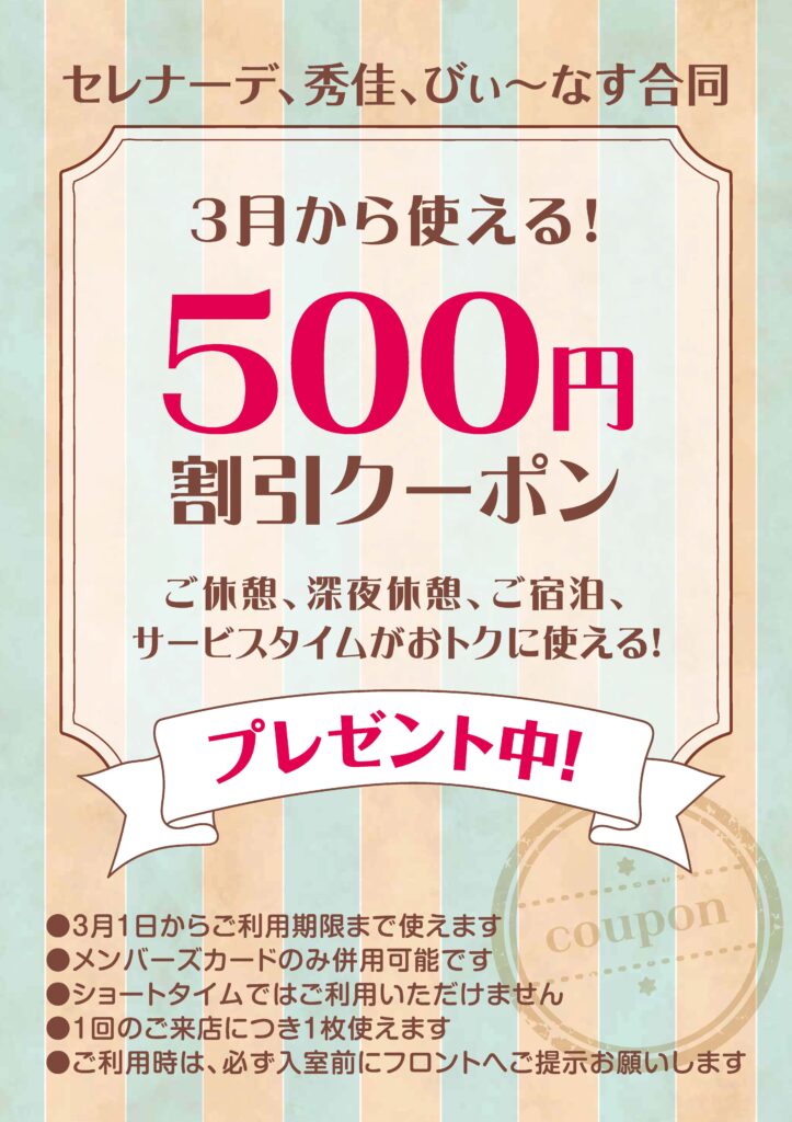 \3月からご利用いただけます/ 500円割引クーポン配布中 2026 3/02 ご休憩・深夜休憩・ご宿泊・サービスタイム対象でメンバーズカードと併用可能です。 今お受け取りいただいた方だけが、割引期間をよりお得にお過ごしいただけます 数に限りがございます。 ぜひこの機会に、ご来店お待ちしております お知らせ